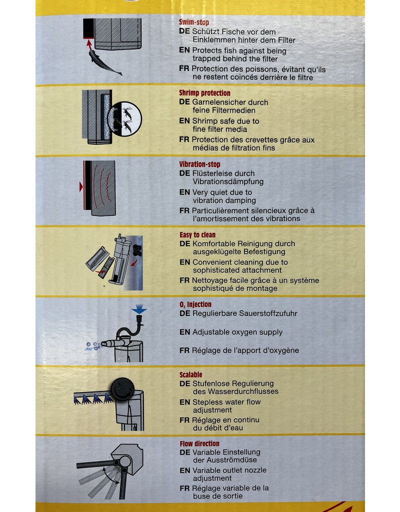 Selbstverständlich wurde – wie bei allen Filtern von sera – auch der Sicherheitsaspekt bei der Konstruktion der sera X-Edge Eckfilter berücksichtigt. Eckfilter können für Fische und Garnelen nämlich unter Umständen gefährlich werden. Dabei gibt es zwei Bereiche zu beachten. Zum einen schwimmen Fische gelegentlich hinter den Eckfilter und laufen Gefahr, dort eingeklemmt zu werden. Aus diesem Grund wurde der “Swim-Stop” integriert, der die Fische daran hindert, hinter den Eckfilter zu schwimmen. Zum anderen krabbeln besonders junge Garnelen häufig durch die Filtermedien in das Innere des Filters – das kann für die Tiere natürlich gefährlich werden. Um dies zu verhindern, wurden passgenaue Filtermedien verwendet.